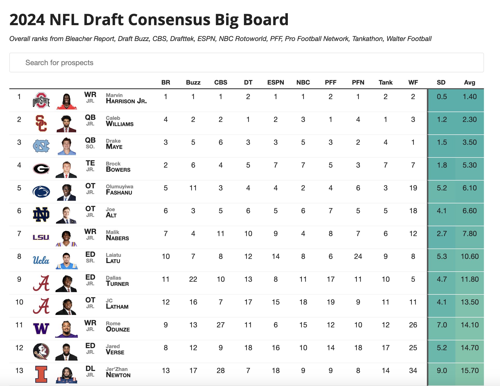 2024 nfl draft consensus big board 2024 NFL Draft consensus Big Board: Is Marvin Harrison Jr. this : In the modern NFL, having high-level playmakers at cornerback is becoming a non-negotiable proposition to combat the new wave of offensive innovation. Much like the class before it, the 2024 NFL Draft . So long, college football season– we’re on to the 2024 NFL draft. I have an update to my prospect rankings for April’s draft. I’ve been doing near-weekly updates to my rankings this fall .